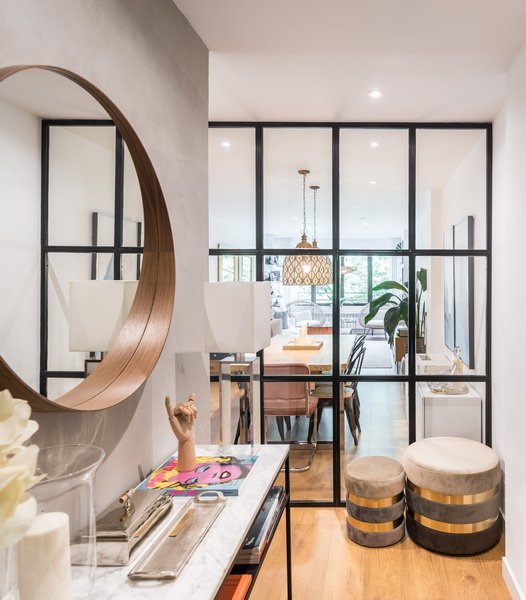 En el acceso a la vivienda se utilizo microcemento y estructura de separación de hierro y vidrio de nuevo para separar la entrada del resto del salón.